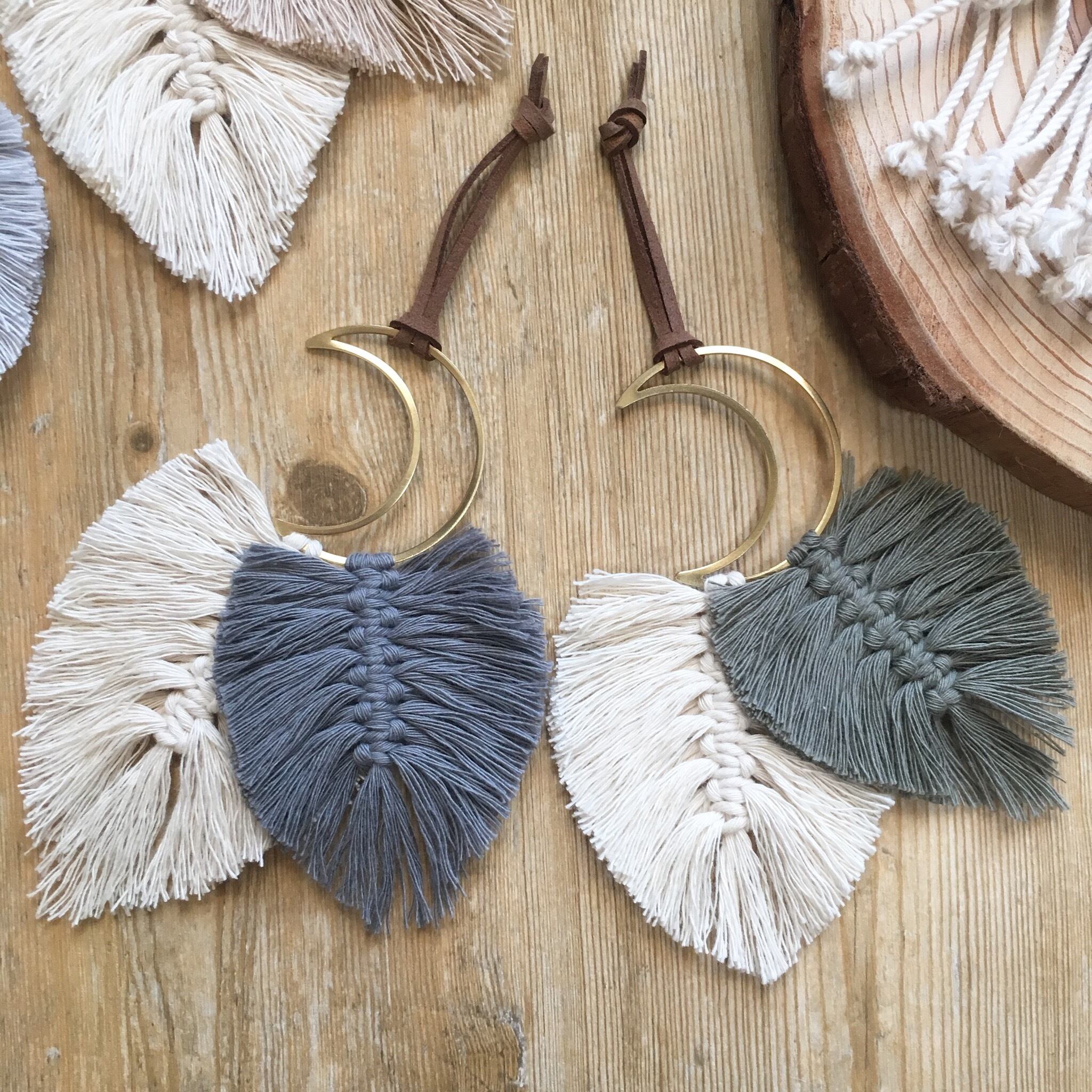 真ちゅうの月に2色のマクラメの羽をつけました。